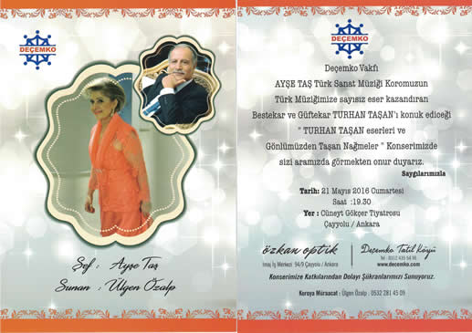 13. KONSERİNİ : DEÇEMKO Vakfı Ayşe Taş Türk Sanat Müziği Korosu Bestekar ve Güftekar Turhan TAŞAN'ın konuk edildiği "TURHAN TAŞAN eserleri ve Gönlümüzden Taşan Nağmeler" adıyla Cüneyt Gökçer Tiyatro Salonunda 21 Mayıs 2016 tarihinde verdi.