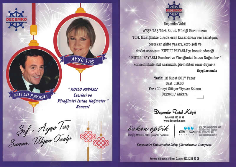 14. KONSERİNİ: DEÇEMKO Vakfı Ayşe Taş Türk Sanat Müziği Korosu "KUTLU PAYASLI Eserleri ve Yüreğimizi Isıtan Nağmeler" adıyla Cüneyt Gökçer Tiyatro Salonunda 12 Şubat 2017 tarihinde verdi.