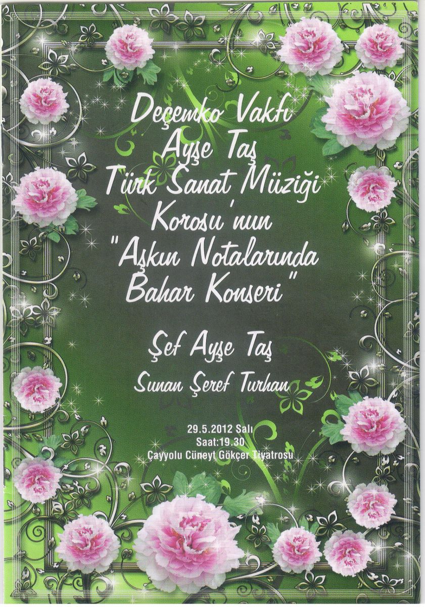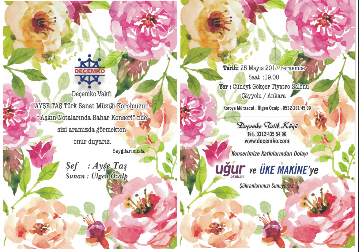 16. KONSERİNİ: DEÇEMKO Vakfı Ayşe Taş Türk Sanat Müziği Korosu "Aşkın Notalarında Bahar Konseri" adıyla Cüneyt Gökçer Tiyatro Salonunda 25 Mayıs 2017 tarihinde verdi.