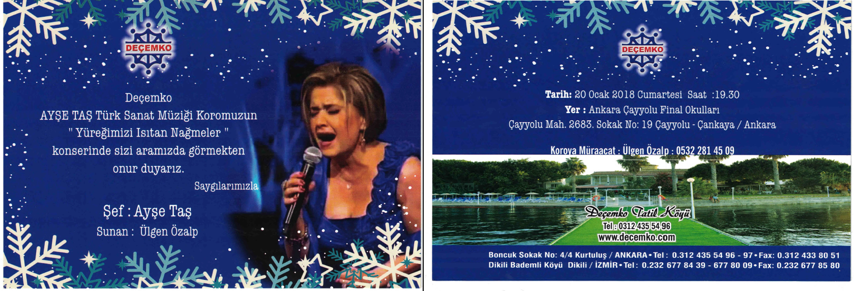 17. KONSERİNİ: DEÇEMKO Vakfı Ayşe Taş Türk Sanat Müziği Korosu "Yüreğimizi Isıtan Nağmeler Konseri" adıyla Cüneyt Gökçer Tiyatro Salonunda 20 Ocak 2018 tarihinde verdi.