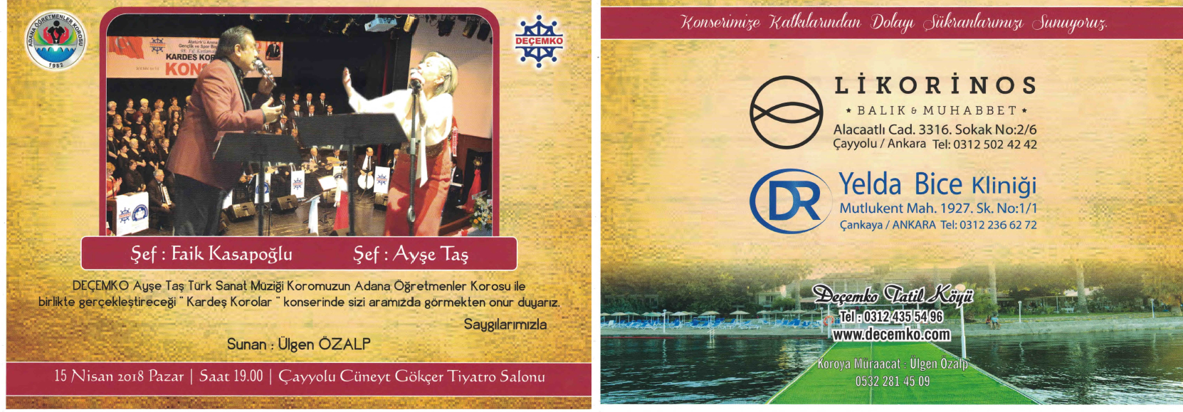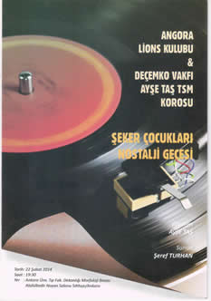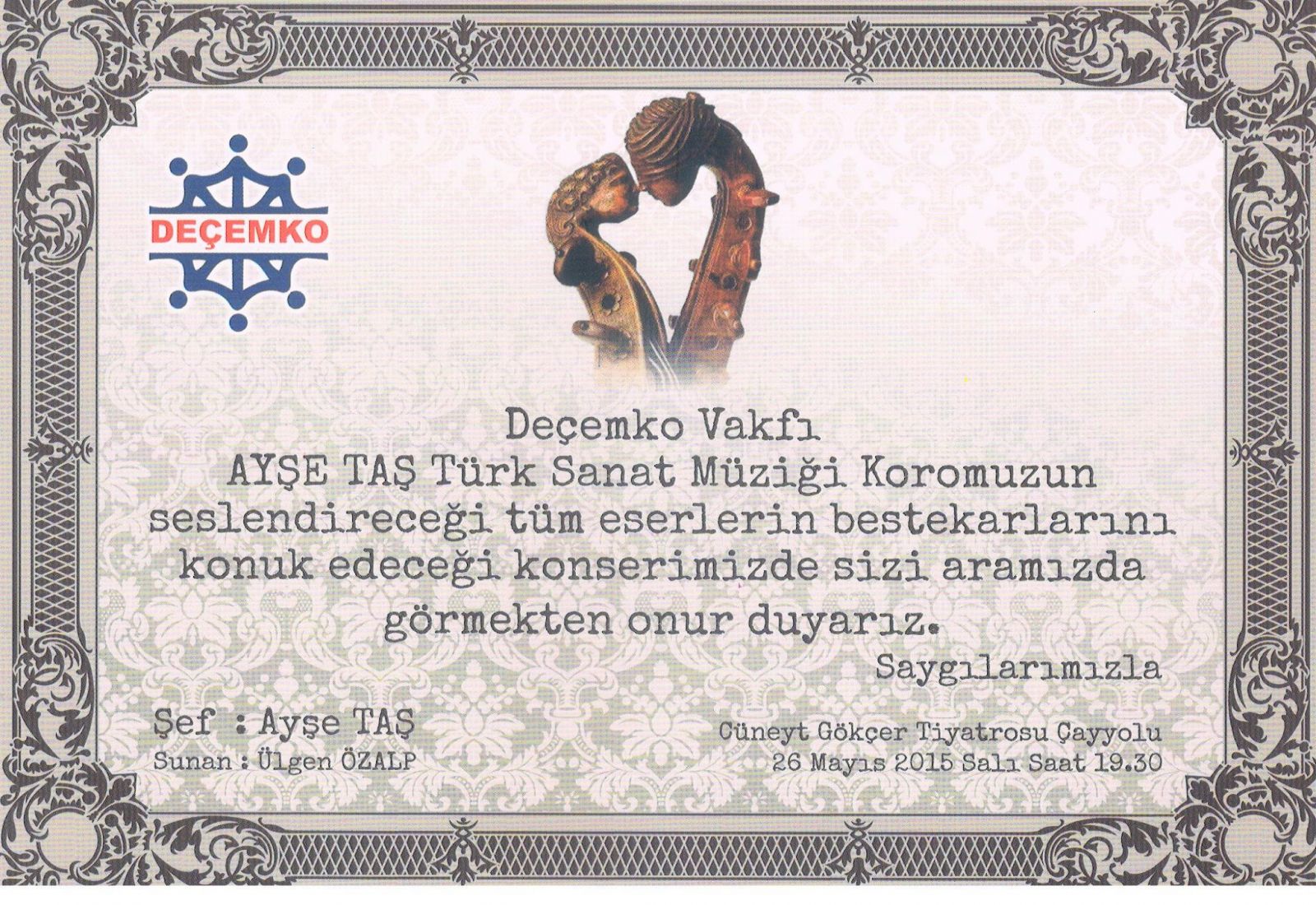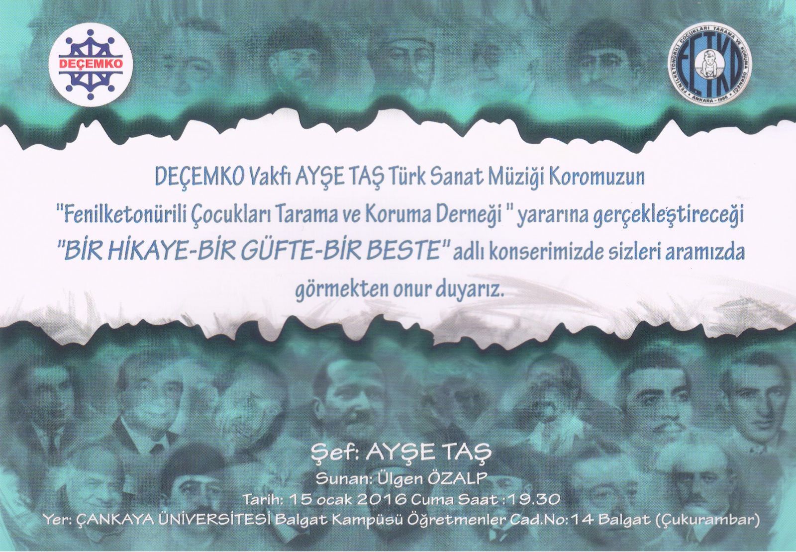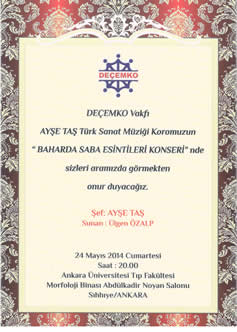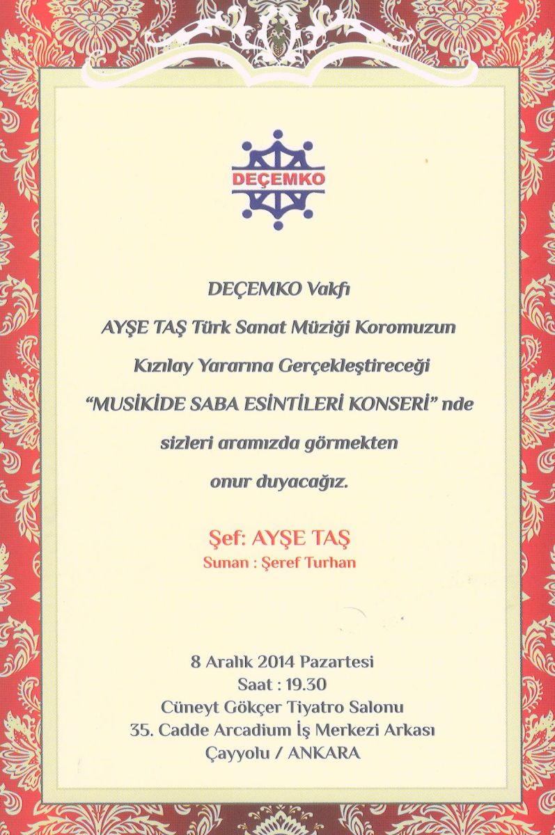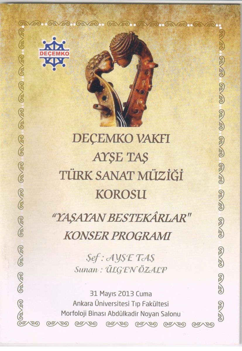 11. KONSERİ: Deçemko Vakfı Ayşe Taş Türk Sanat Müziği Korosu " Bir Hikaye-Bir Güfte-Bir Beste" adıyla " Fenilketonürili Çocukları Tarama ve Koruma Derneği" yararına Çankaya Üniversitesi Salonunda 15 Ocak 2016 tarihinde verdi.