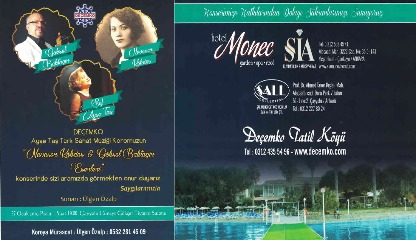 22. KONSERİNİ: DEÇEMKO Vakfı Ayşe Taş Türk Sanat Müziği Korosu ‘’ Neveser Kökdeş & Göksel Baktagir Eserleri’’ adıyla Göksel Baktagir’in de katılımıyla Cüneyt Gökçer Tiyatro Salonunda 27 Ocak 2019 tarihinde verdi.