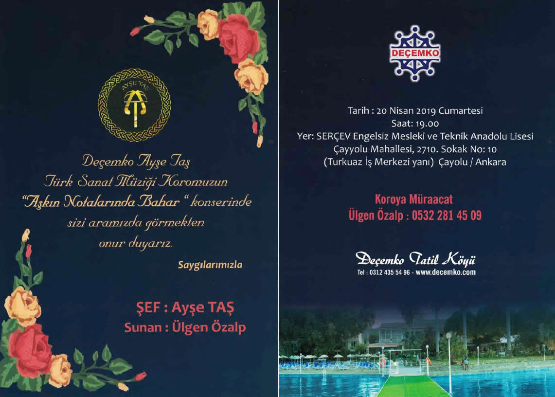 24. KONSERİNİ: DEÇEMKO Vakfı Ayşe Taş Türk Sanat Müziği Korosu ‘’ Aşkın Notalarında Bahar Konseri ‘’ adıyla SERÇEV Engelsiz Mesleki ve Teknik Anadolu Lisesi salonunda 20 Nisan 2019 tarihinde verdi.