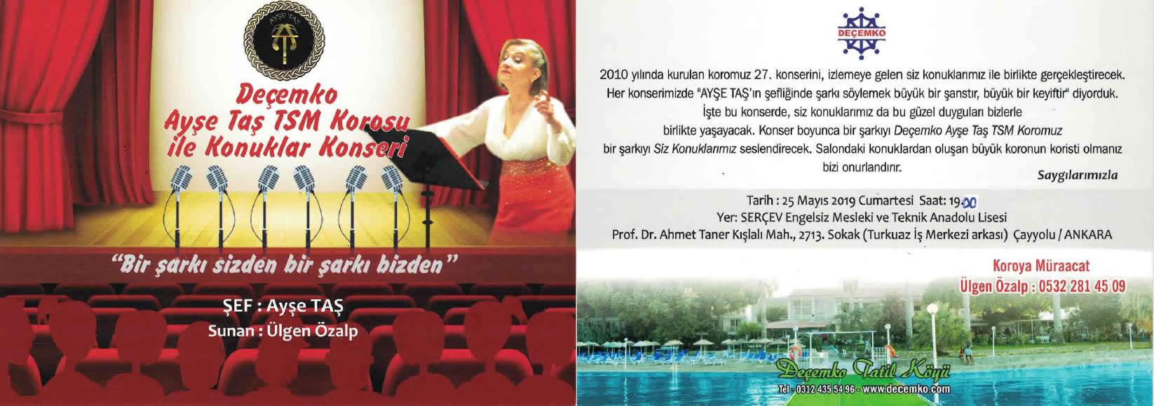 25.KONSERİNİ: DEÇEMKO Vakfı Ayşe Taş Türk Sanat Müziği Korosu ‘’Bir Şarkı Sizden - Bir Şarkı Bizden ’’ adlı konserini iftar yemeği de verilerek, Ramazan eğlencesi olarak SERÇEV Engelsiz Mesleki ve Teknik Anadolu Lisesi salonunda 25 Mayıs 2019 tarihinde verdi.