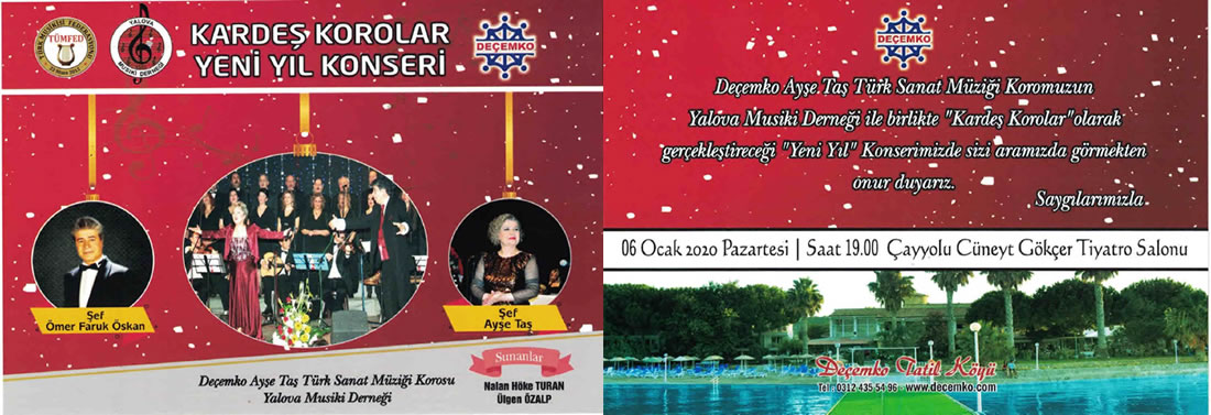 26. KONSERİNİ: DEÇEMKO Vakfı Ayşe Taş Türk Sanat Müziği Koromuzun Yalova Musiki Derneği ile birlikte gerçekleştirdiği "Kardeş Korolar Yeni Yıl Konseri" adıyla Cüneyt Gökçer Tiyatro Salonunda 06 Ocak 2020 tarihinde verdi.