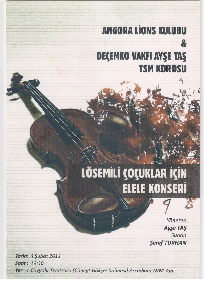 2. KONSERİNİ: “ LÖSEMİLİ ÇOCUKLAR İÇİN ELELE “ adıyla Şef AYŞE TAŞ Yönetiminde 4.Şubat.2013 tarihinde Çayyolu Cüneyt Gökçer Salonunda verdi.