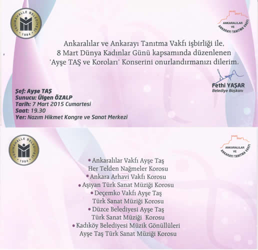 7. KONSERİNİ: ''Ayşe TAŞ ve Koroları'' adıyla Dünya Kadınlar Günü kapsamında 07 Mart 2015 tarihinde Nazım Hikmet Kongre ve Sanat Merkezinde verdi.
