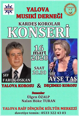 27. KONSERİNİ: DEÇEMKO Vakfı Ayşe Taş Türk Sanat Müziği Koromuzun Yalova Musiki Derneği ile birlikte gerçekleştireceği "Kardeş Korolar Konseri" adıyla Yalova Raif Dinçkök Kültür Merkezi Salonunda 16 Mart 2020 tarihinde verecek.