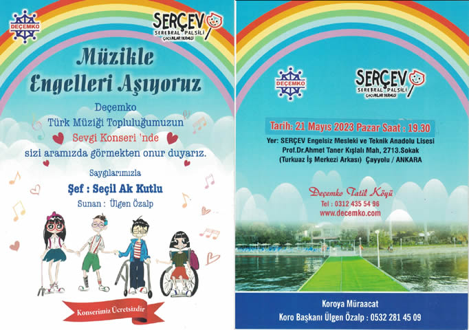 28. KONSERİNİ: DEÇEMKO Türk Müziği Topluluğumuzun Serebral Palsili Çoçuklar için gerçekleştirdiği Sevgi Konseri adıyla SERÇEV Engelsiz Mesleki ve Teknik Anadolu Lisesi Salonunda 21 Mayıs 2023 tarihinde verdi.