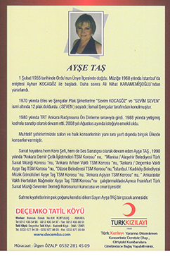 6. KONSERÝNÝ: '' MUSÝKÝDE SABA ESÝNTÝLERÝ KONSERÝ '' adýyla Kýzýlay yararýna Þef AYÞE TAÞ yönetiminde 08 Aralýk 2014 tarihinde Çayyolu Cüneyt Gökçer Salonunda verdi.