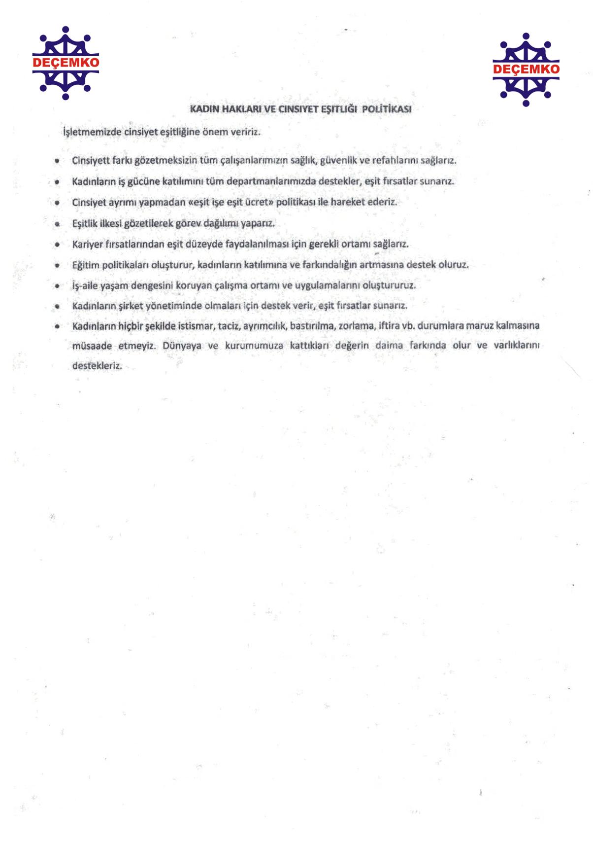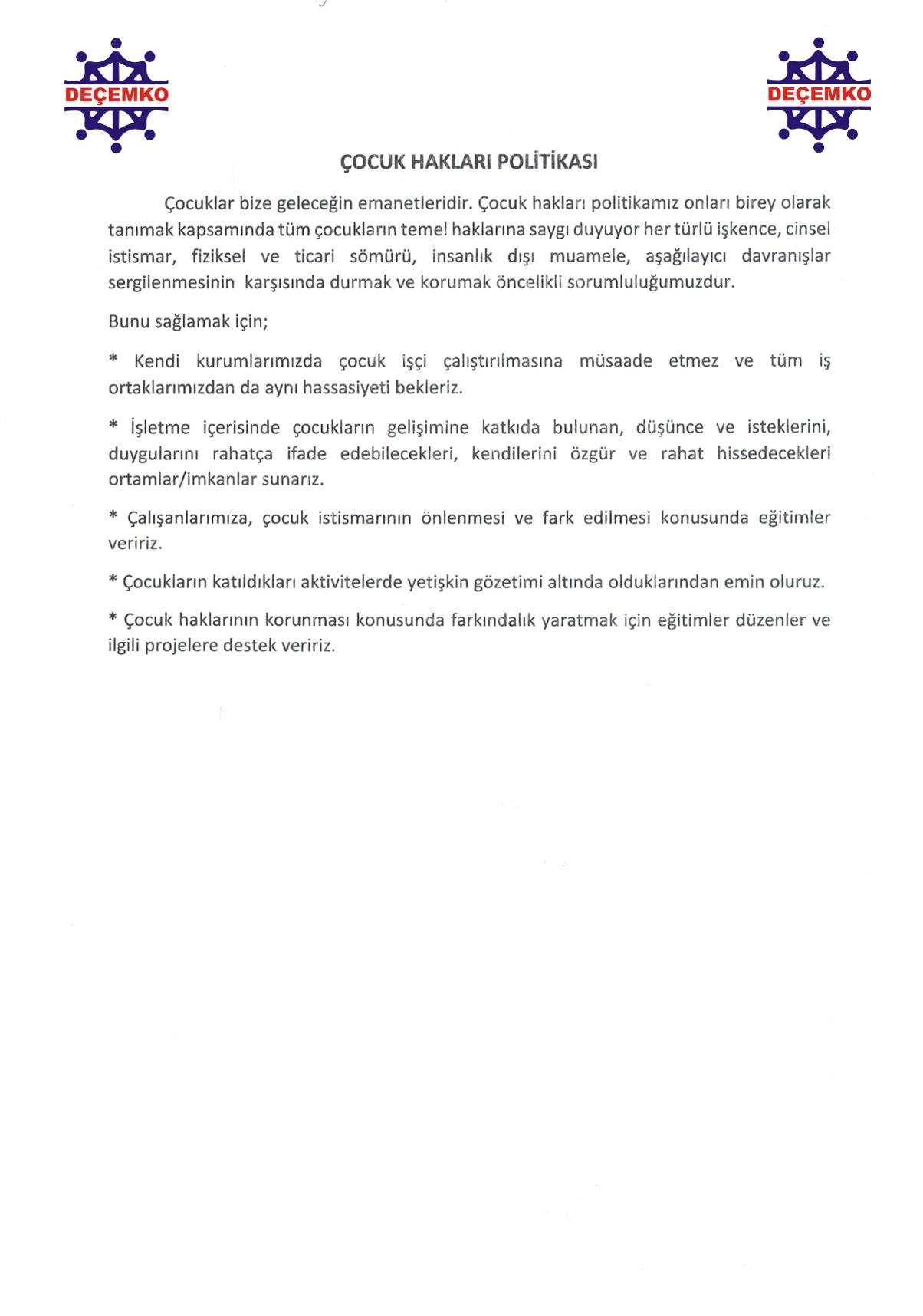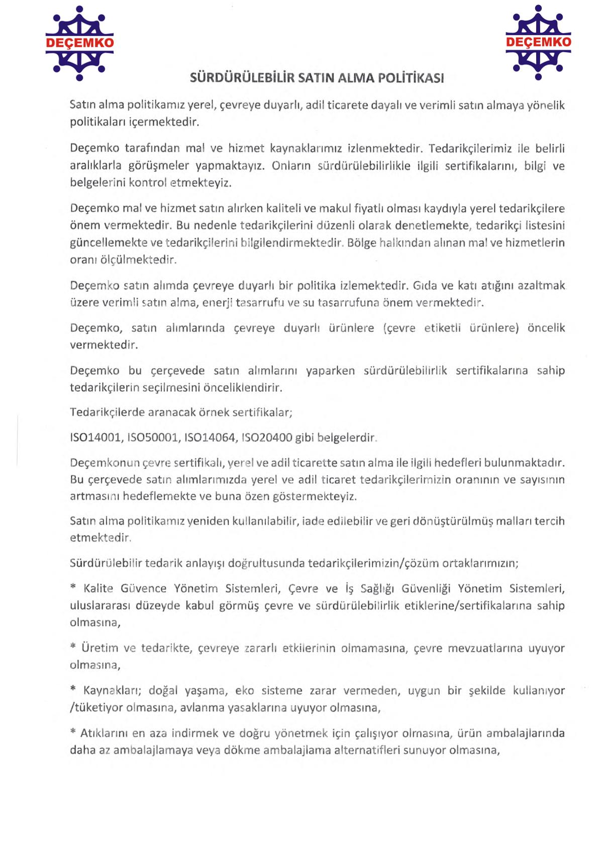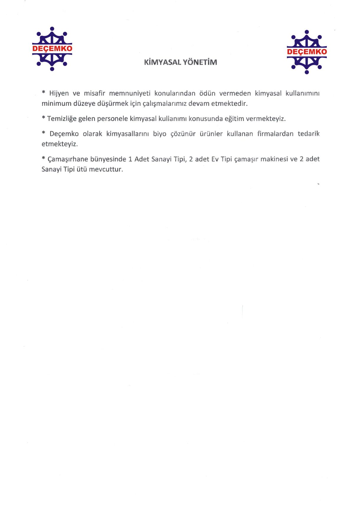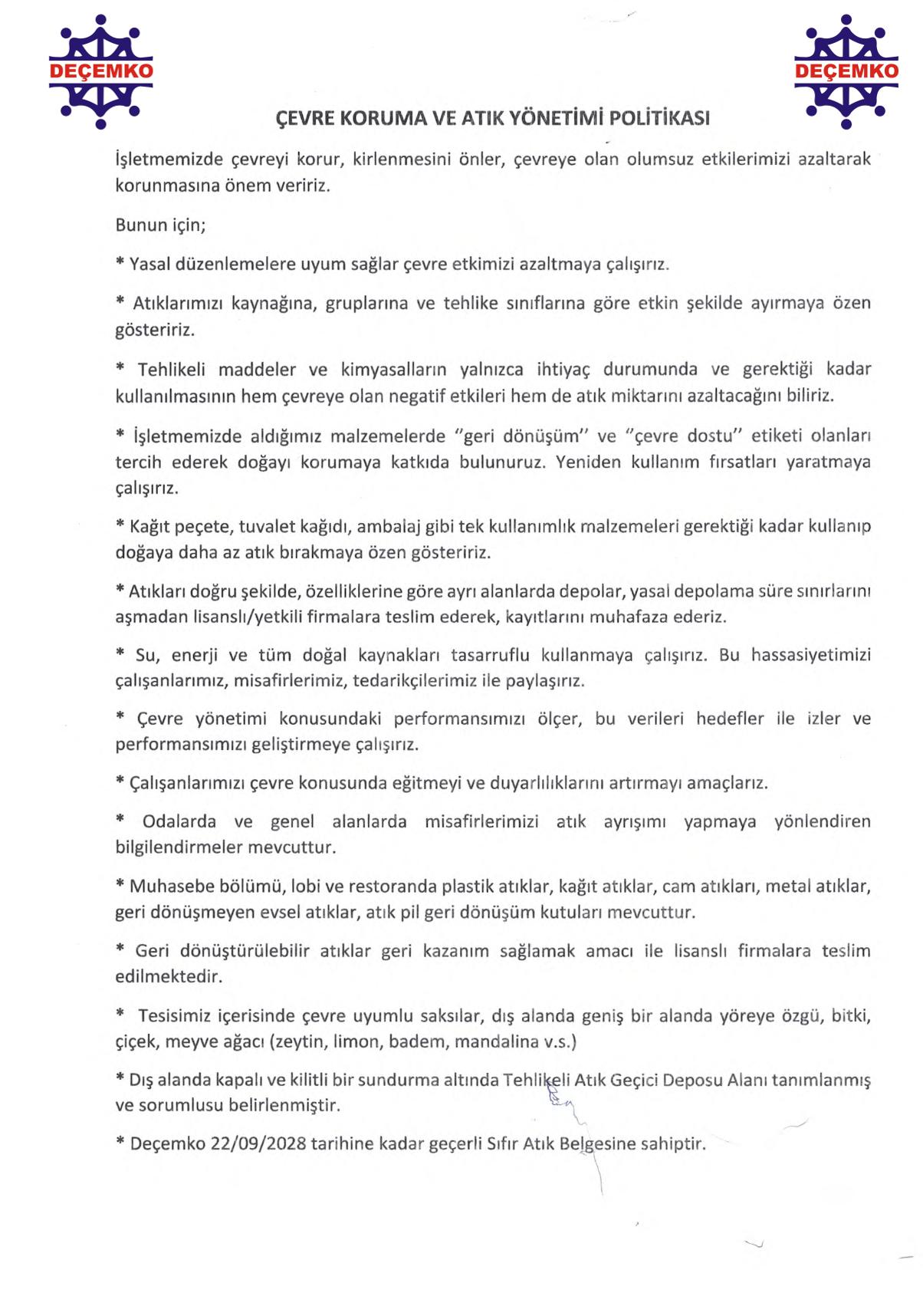 DEÇEMKO OTELİ Sürdürülebilir Turizm Politikası